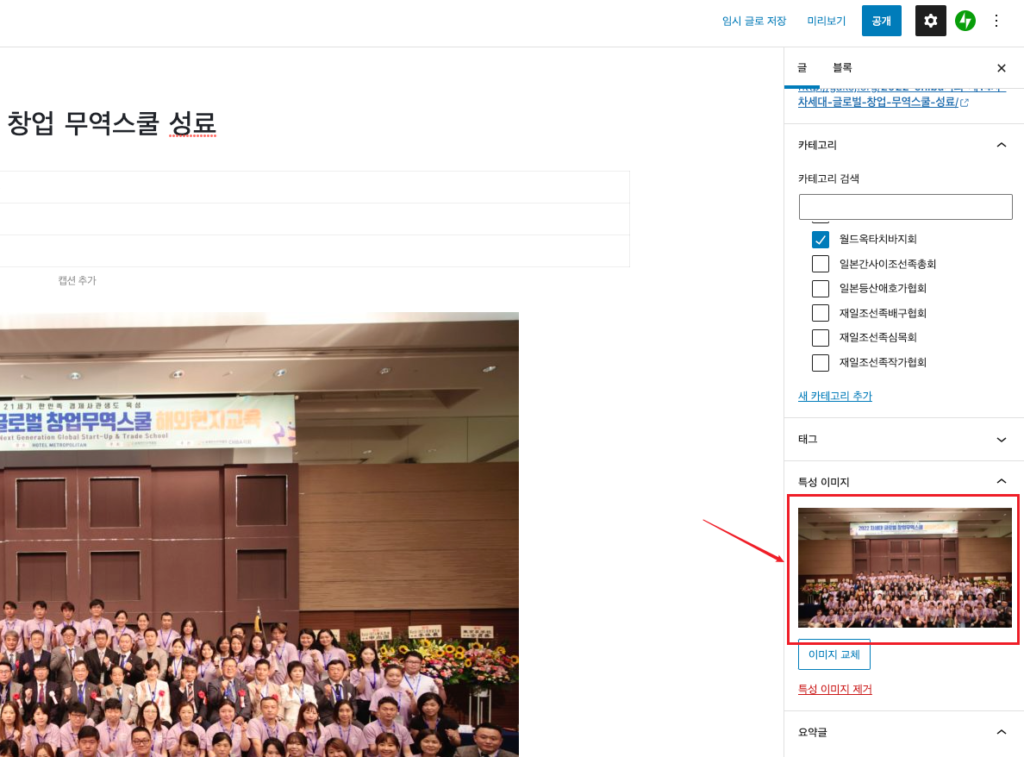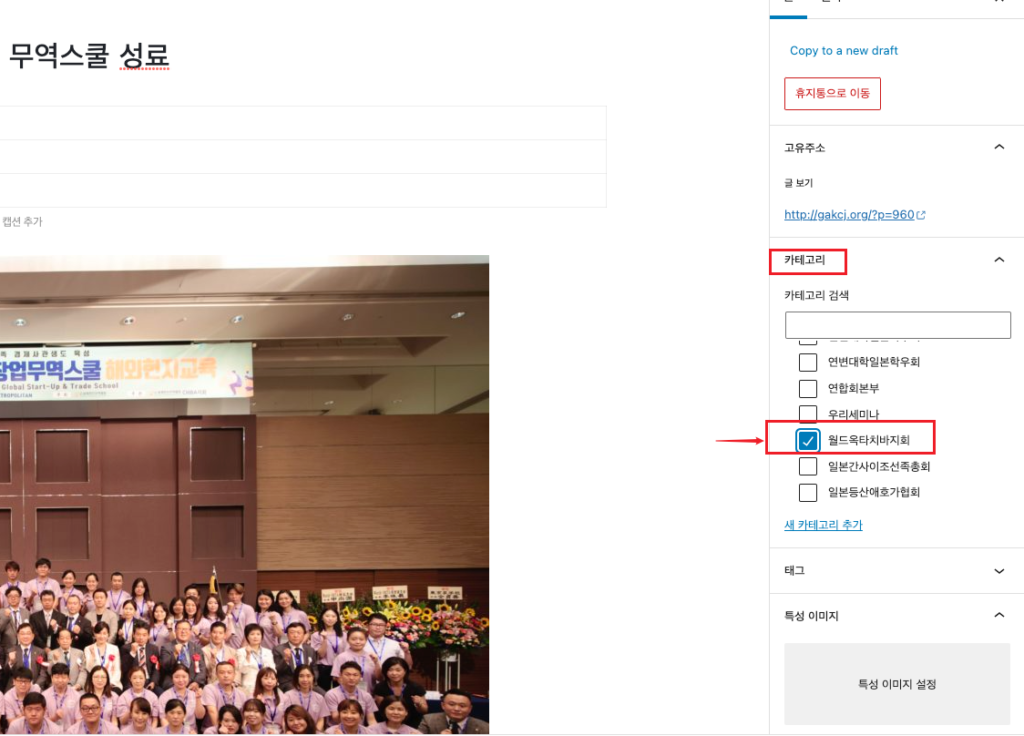 때문에 카테고리에서 관련되어 있는 단체를 찾아 채크를 넣어줍니다.(카테고리는 원칙적으로 하나만 지정합니다. )