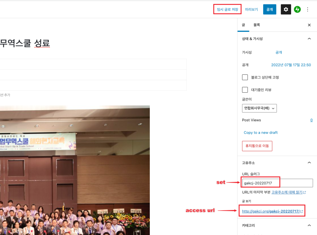"임시글로저장"을 클릭해서 주소편집이 가능한 상태로 만든후, 주소를 지정해줍니다.
