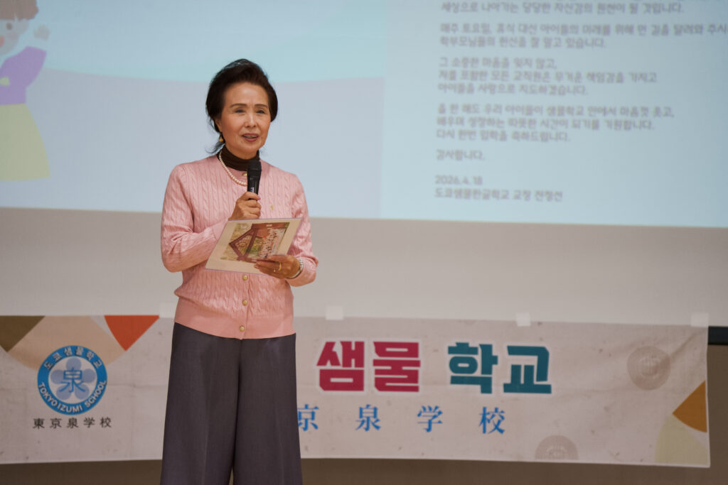 교장선생님은 환영사를 통해 “도쿄샘물학교는 학생들의 성장을 함께하는 교육 공동체로서, 아이들이 건강한 정체성과 미래를 키워갈 수 있도록 최선을 다하겠다”고 밝혔다. 또한 다문화 환경 속에서 한국어와 한국 문화를 배우는 교육의 중요성을 강조하며, 학생들이 자긍심을 갖고 성장하길 바란다고 전했다.