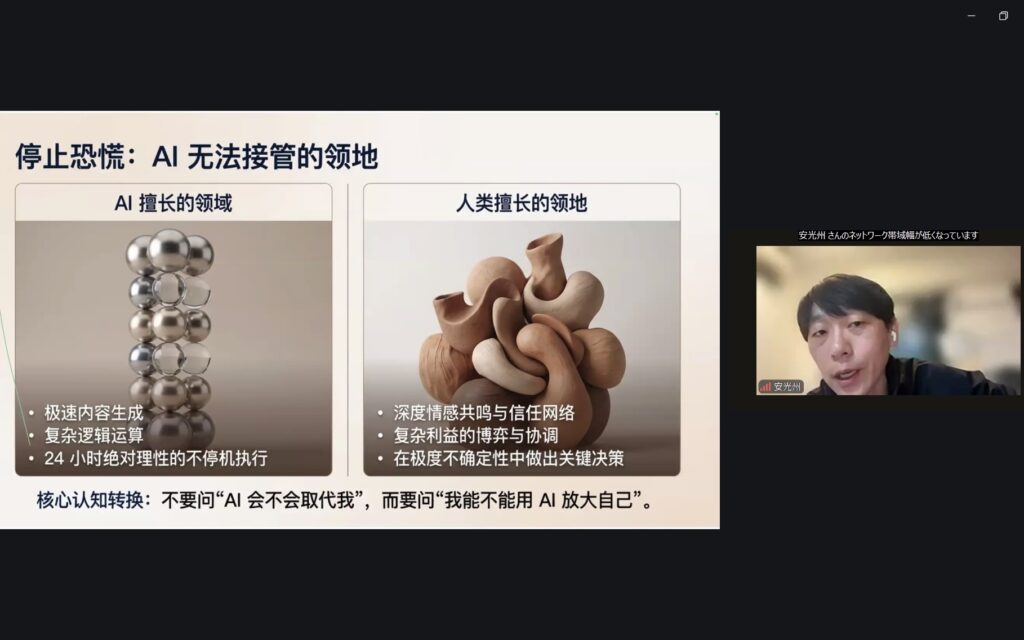 전일본중국조선족연합회 김광림회장은 “AI 시대를 맞아 누구나 빠르게 변화하는 흐름을 이해하고 대응할 수 있도록 돕기 위해 이번 강연을 준비했다”며, “6월 27일에는 백세시대의 건강을 위한 온라인 강좌를 개최하게 되며 앞으로도 실질적인 도움이 되는 강좌를 조직하게 될 것”이라고 밝혔다.